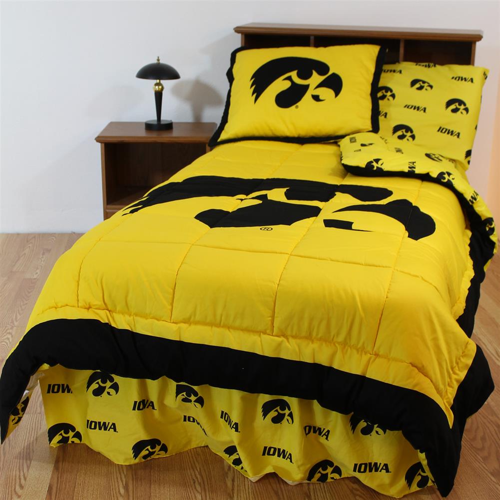 College Covers brand Bed in Bag includes a reversible comforter logo patterned team color sheet set printed bed skirt and sham (s). All items are 100% cotton sateen 200 thread count for a softer feel than any other collegiate bedding available. Comforter has the University logo printed large on front with an all over logo pattern printed on the back giving you a truly reversible comforter with two unique looks. Sheets pillow case(s) and bed skirt are printed with the same all over pattern as back of comforter. Twin size sets come with one sham full queen and king size sets come with two shams.